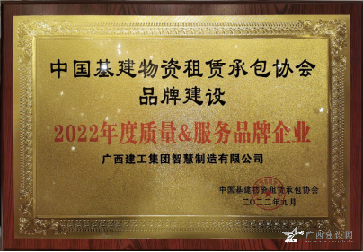 廣西建工集團智慧制造有限公司榮獲“2022年度質(zhì)量服務(wù)品牌企業(yè)”,公司董事長、黨總支書記李日紅榮獲“2022 年全國基建物資租賃承包行業(yè)杰出創(chuàng)新人才”稱號。